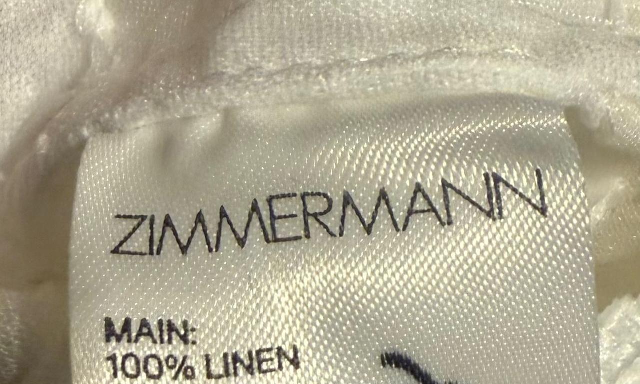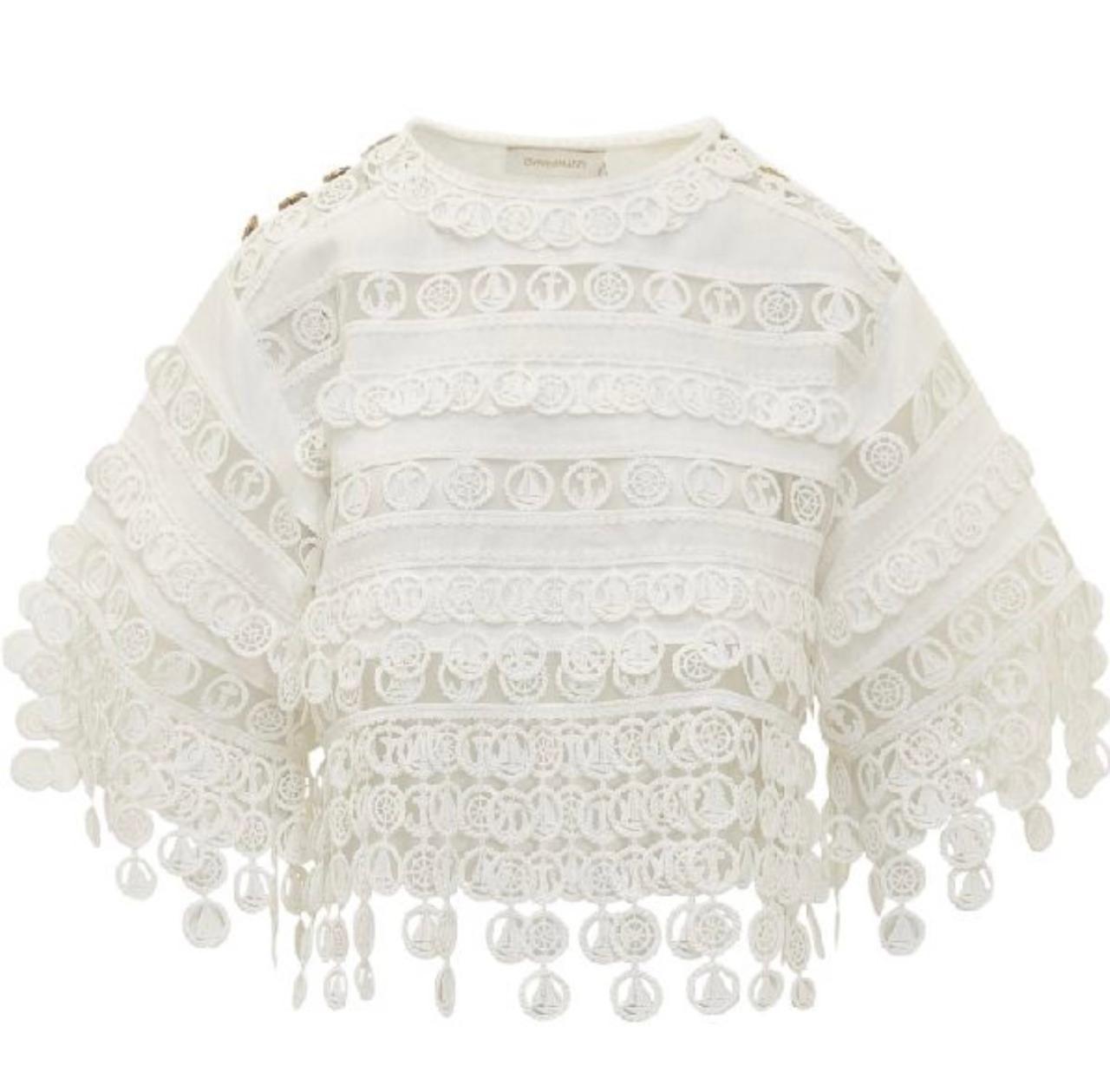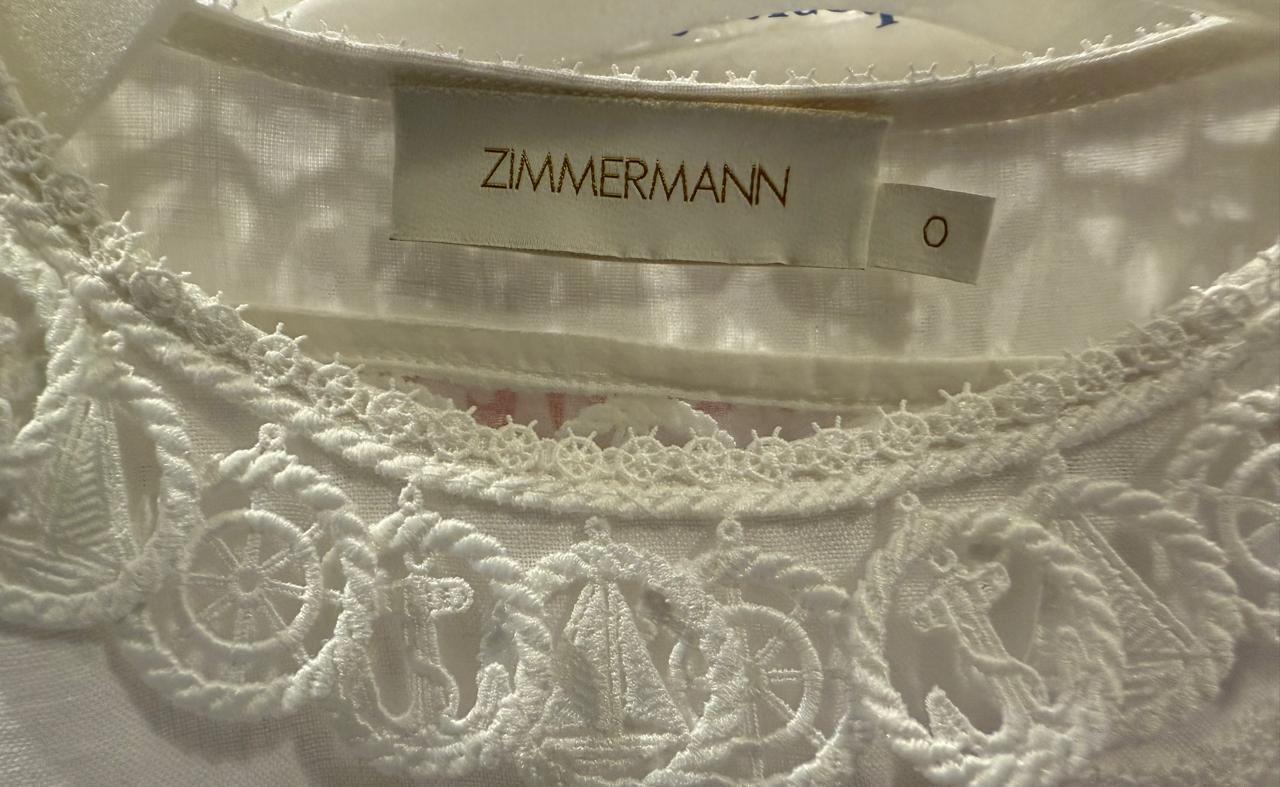 Zimmermann’s High Tide Nautical Top is a beautifully detailed lace piece featuring delicate embroidered motifs inspired by the sea — including anchors, sailboats, and ship wheels. Designed with a round neckline, gold-tone shoulder buttons, and a scalloped hem, it captures the brand’s signature coastal elegance.